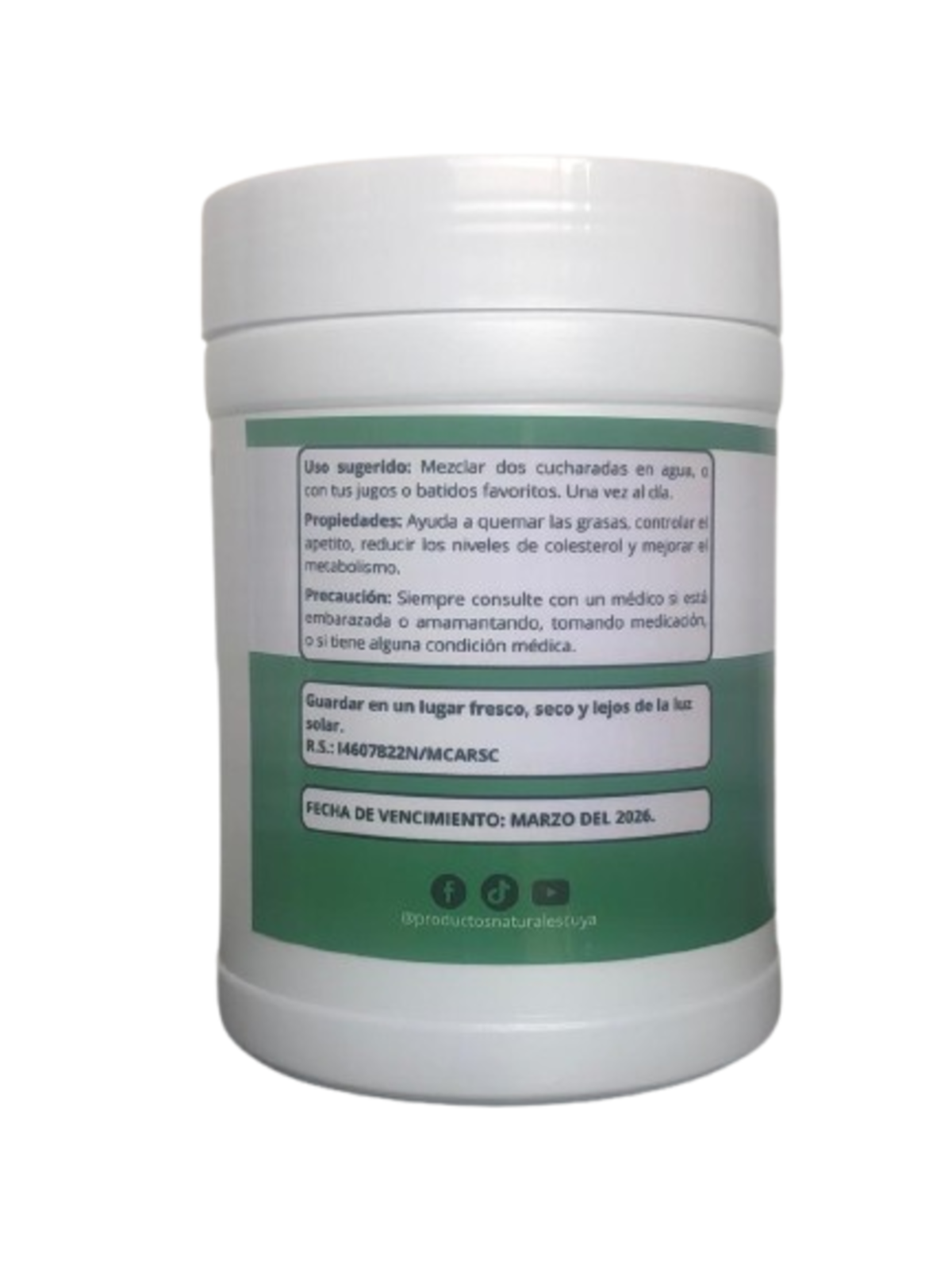 Producto natural, sin aditivos ni gluten, apto para veganos